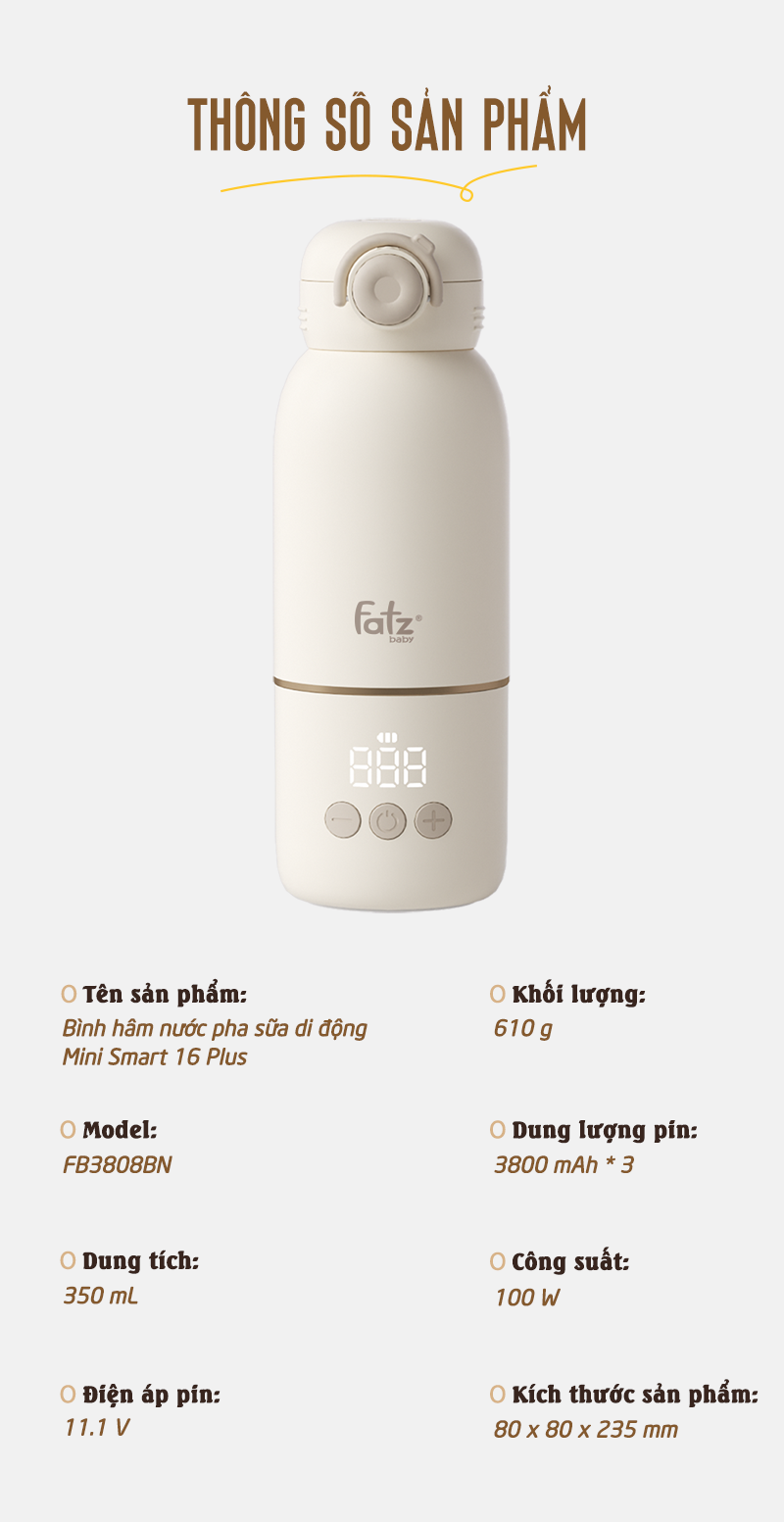 Thông số kĩ thuật của bình đun và hâm nước pha sữa di động Fatzbaby Mini Smart 16 Plus FB3808BN: