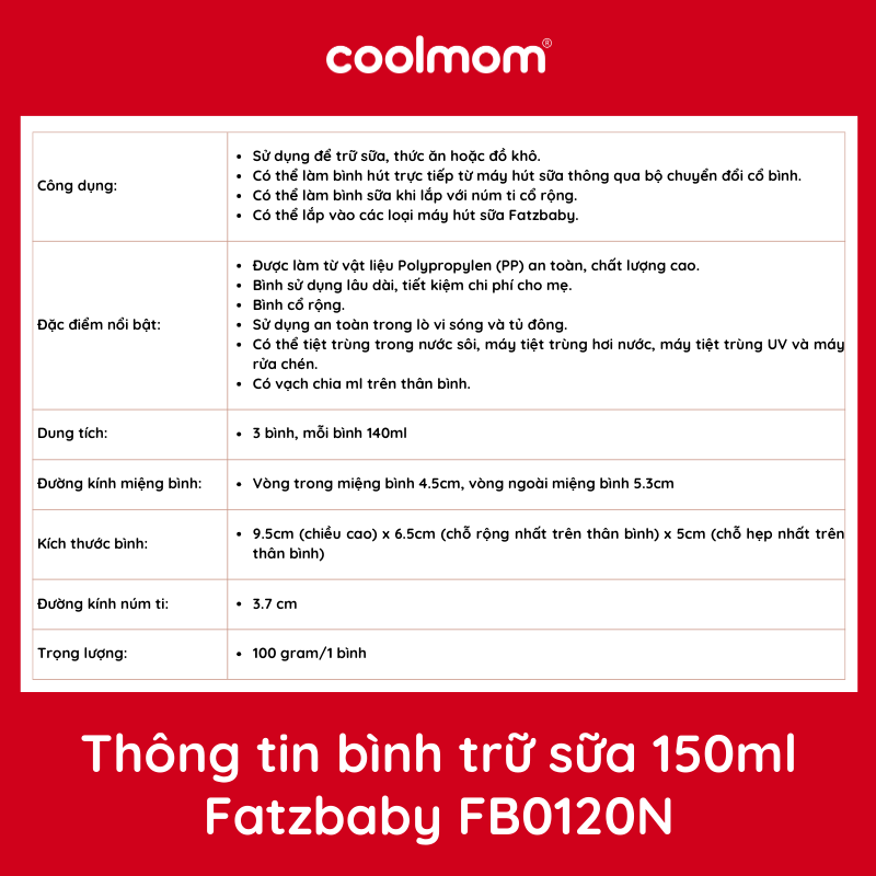 THỔNG SỐ KỸ THUẬT BỘ 3 BÌNH TRỮ SỮA MẸ FATZBABY STORE 2 140ML FB0140VN: