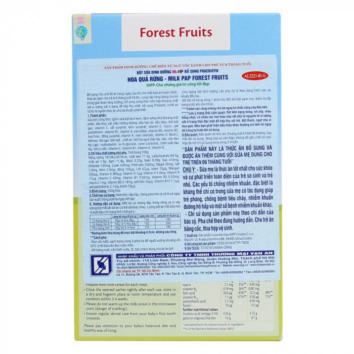 Bột ăn dặm HiPP 250g dinh dưỡng sữa hoa quả rừng có chứa 46% sữa bột công thức, cung cấp năng lượng cho trẻ trong giai đoạn tăng trưởng, bổ sung chất xơ giúp trẻ dễ tiêu hóa, ngừa táo bón.