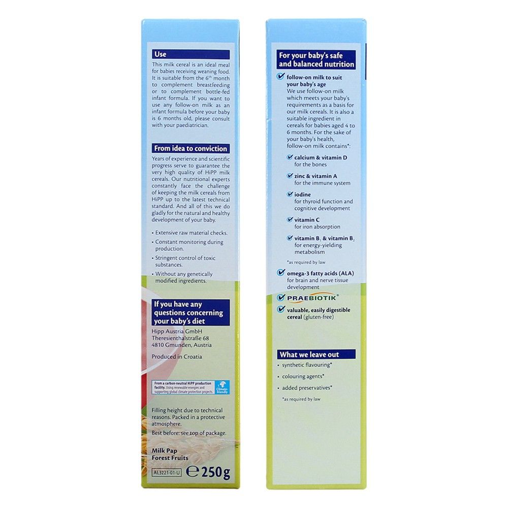 - Sản phẩm có hương thơm tự nhiên, không chứa phẩm màu, chất bảo quản, đường tinh luyện, đặc biệt không chứa Gluten, giúp mẹ yên tâm tin tưởng vào bột dinh dưỡng HiPP.