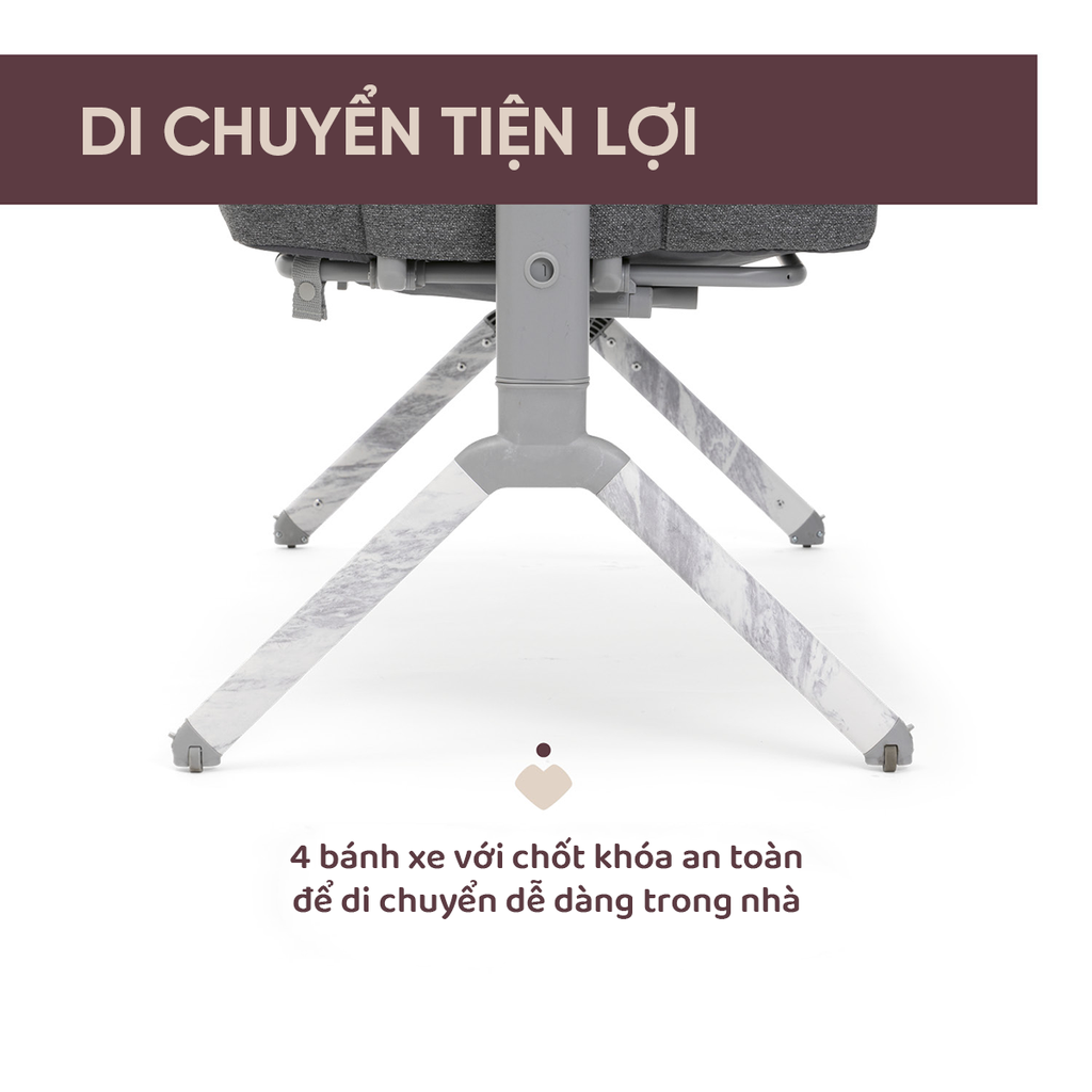 Chân cũi được trang bị 4 bánh xe (có chốt khóa) giúp ba mẹ dễ dàng di chuyển trong nhà.