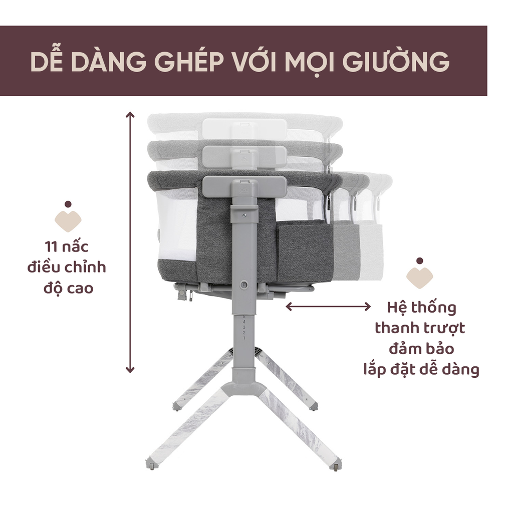 Cũi có 11 nấc điều chỉnh độ cao, dễ dàng ghép nôi cạnh giường ba mẹ.