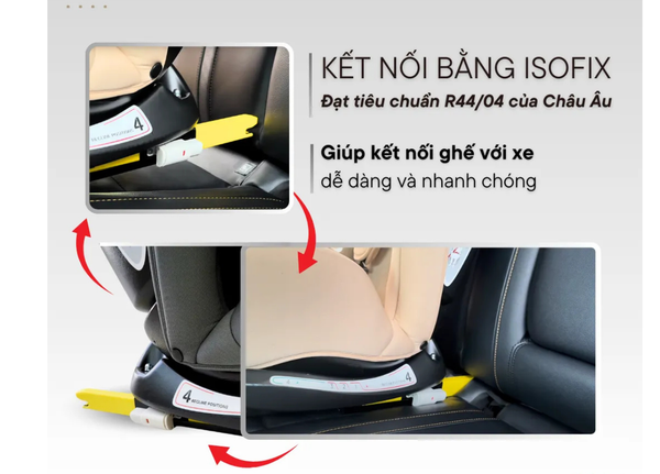 • Lắp đặt bằng chốt Isofix chắc chắn, đạt tiêu chuẩn an toàn Châu Âu ECE R44/04.