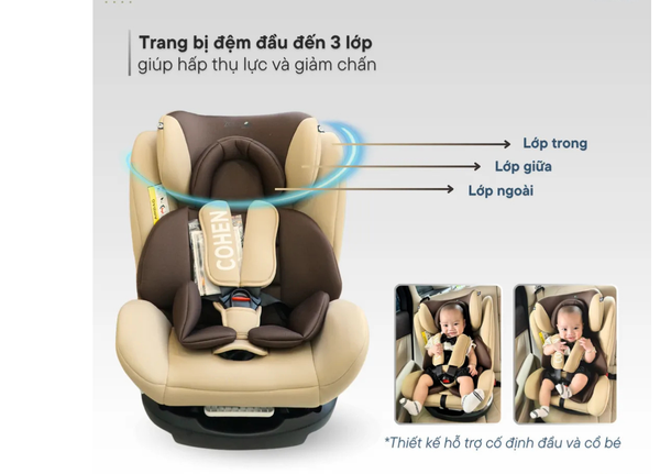 Đệm đầu thiết kế 3 lớp thông minh, giúp hấp thụ lực và giảm chấn hiệu quả khi xảy ra va chạm, đồng thời hỗ trợ cố định đầu và cổ bé