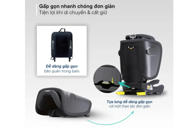 • Ghế ô tô trẻ em gấp gọn (50 x 21 x 37 cm), trọng lượng nhẹ chỉ 6kg.