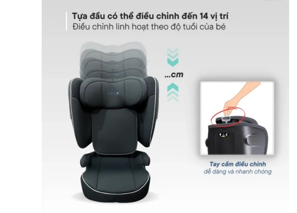 Thiết kế tựa đầu có thể nâng hạ đến 14 nấc linh hoạt, dễ dàng tùy chỉnh chiều cao phù hợp theo độ tuổi và vóc dáng của trẻ, đồng thời hỗ trợ tư thế ngồi chuẩn, bảo vệ tốt vùng đầu – cổ trước mọi tác động bên ngoài.