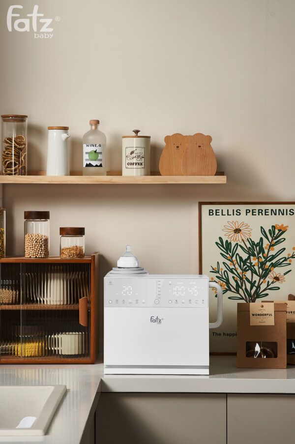 Máy thứ ba là Máy đun và hâm nước pha sữa sở hữu dung tích lớn 1300ml, đáp ứng nhu cầu sử dụng của cả gia đình. Khả năng giữ ấm liên tục lên đến 24 giờ ở nhiệt độ từ 35°C đến 95°C giúp bạn luôn có nước ấm sẵn sàng để pha sữa cho bé bất cứ lúc nào. Bên cạnh đó, máy được trang bị quạt làm mát mạnh mẽ với 2 tốc độ tùy chỉnh, giúp hạ nhiệt độ nước nhanh chóng đến mức lý tưởng để pha sữa công thức hoặc các loại đồ uống khác.