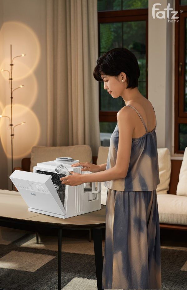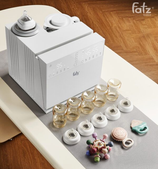 Máy thứ nhất là Máy tiệt trùng UVC tiên tiến có dung tích lớn 8.5 lít, cho phép tiệt trùng cùng lúc nhiều bình sữa và vật dụng của bé. Với 10 đèn UVC-LED công suất cao được bố trí khoa học trên cả hai bề mặt máy, mọi ngóc ngách đều được khử trùng hiệu quả, loại bỏ đến 99.9% vi khuẩn gây hại. Hai mức nhiệt độ sấy 45°C và 65°C cho phép bạn lựa chọn chế độ phù hợp với từng loại chất liệu bình sữa, đảm bảo an toàn và kéo dài tuổi thọ sản phẩm.