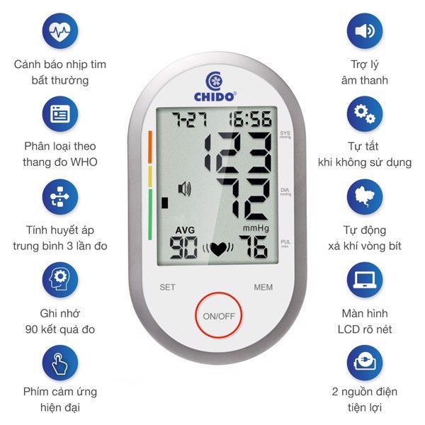Tự động đo huyết áp và nhịp tim, cảnh báo nhịp tim bất thường: Chỉ sau một vài thao tác đơn giản, dù người già hay trẻ nhỏ đều có thể tự thực hiện tại nhà, máy đo huyết áp cảm ứng Chido sẽ giúp người dùng theo dõi và phát hiện các bệnh về huyết áp và tim mạch.