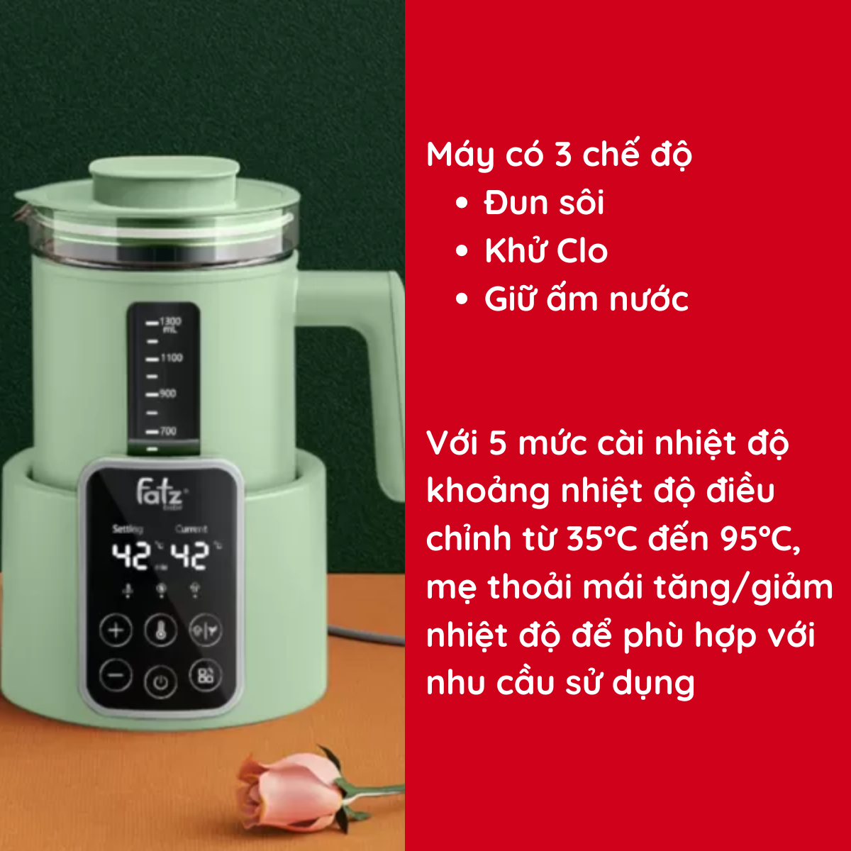 - 5 mức cài đặt giữ ấm: 45ºC và 55ºC để pha sữa, 70ºC để pha bột ăn dặm, bột ngũ cốc, 80ºđể để pha trà và 90ºC pha cà phê