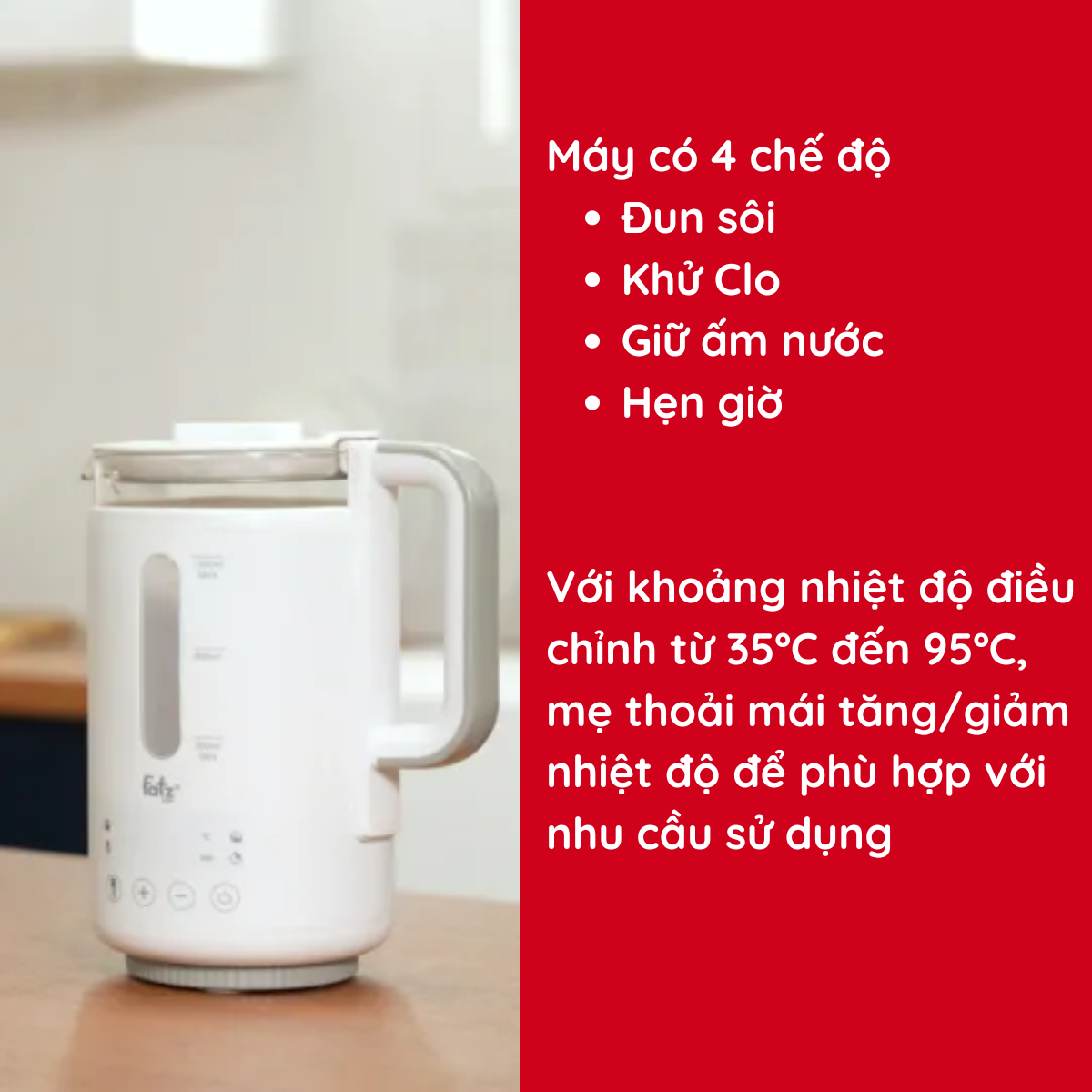 Chức năng:  Đun sôi - Khử Clo - Giữ ấm nước