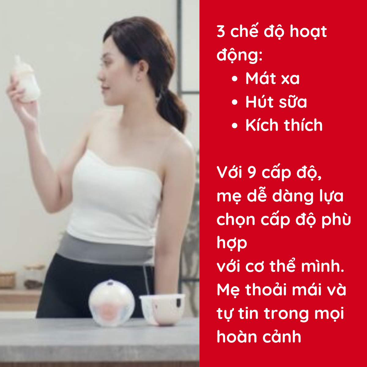 - Màn hình LED điều khiển bằng các nút cảm ứng, đèn LED đổi màu chỉ thị từng chế độ hút. Có 3 chế độ hoạt động, đó là mát xa, kích thích và hút sữa (với 9 cấp độ).