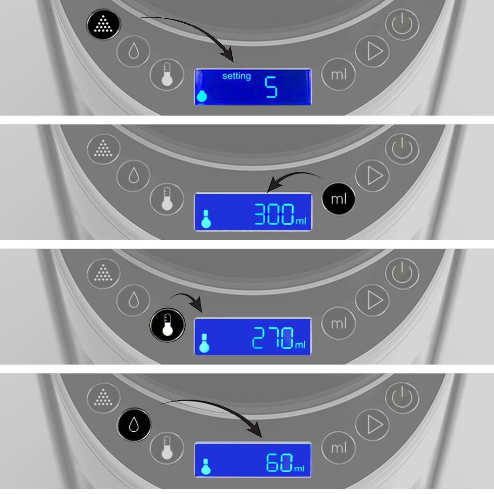 • Các mức sữa có thể pha: Tương đương 60ml, 90ml, 120ml, 150ml, 180ml, 210ml, 240ml, 270ml, 300ml.