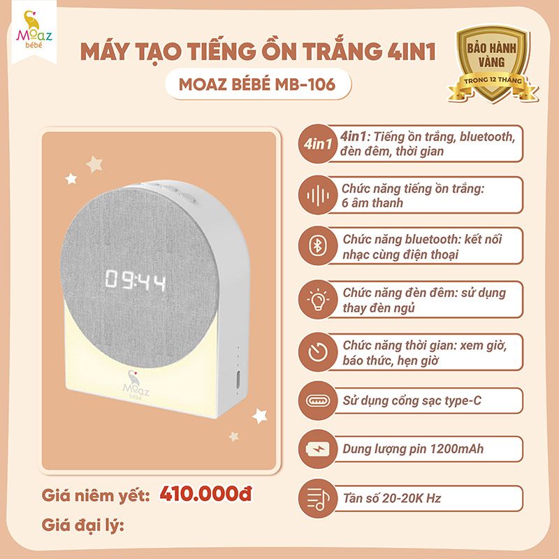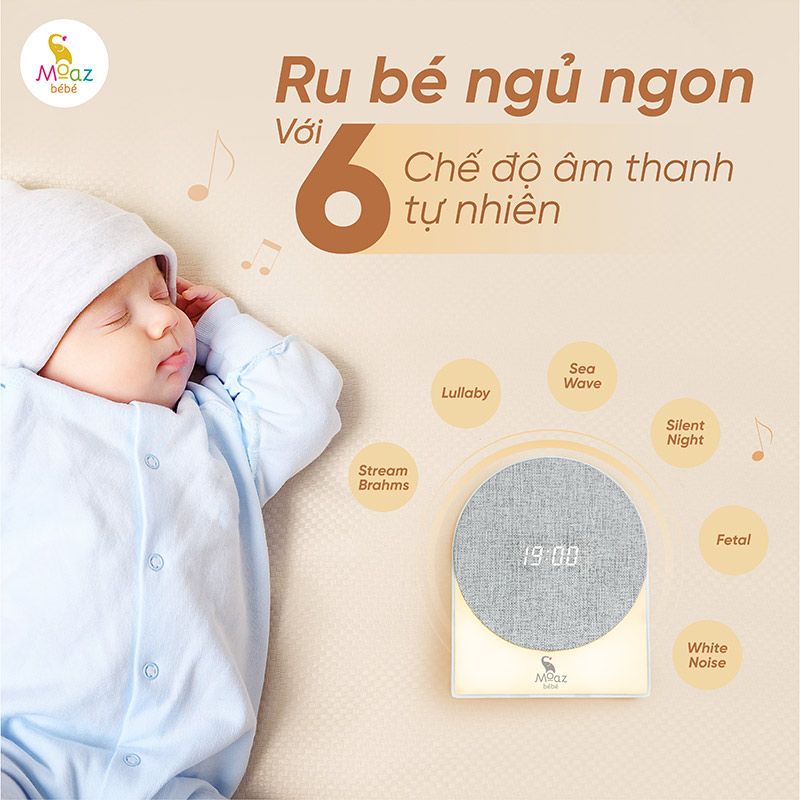 Máy tạo tiếng ồn trắng 4 trong 1 Moaz BéBé MB-106 là thiết bị phát ra 6 cấp độ âm thanh đặc biệt, mô phỏng các âm thanh trong tự nhiên, lặp đi lặp lại để ngăn cản sự phiền nhiễu từ tiếng ồn xung quanh. Sản phẩm giúp mẹ và bé được thư giãn, dễ dàng đi vào giấc ngủ. Bên cạnh đó, máy tích hợp các chức năng hẹn giờ, báo thức, … giúp mẹ xây dựng giấc ngủ khoa học cho con yêu.