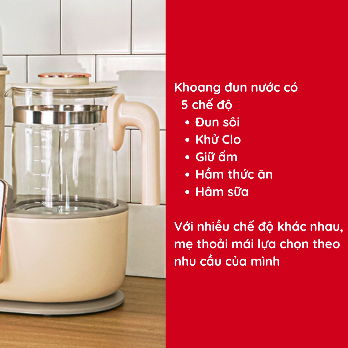 - Bố mẹ có thể vừa đun nước giữ nhiệt pha sữa, vừa tiệt trùng sấy khô bình sữa, hầm chè chưng yến, hâm sữa trong cùng 1 chiếc máy giúp tiết kiệm tối đa thời gian.