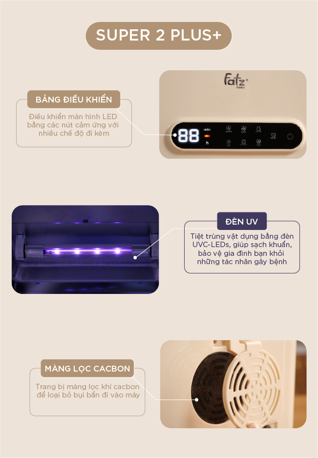Là phiên bản nâng cấp của Fatzbaby Super 2, máy tiệt trùng bình sữa và sấy khô Fatzbaby Super 2 Plus có thêm 2 chức năng làm sữa chua và sấy hoa quả cực kỳ tiện lợi. Bóng đèn LED thay vì tuýp chiếu tia UVC, kết hợp với lõi thép siêu gương, máy tiệt trùng bình sữa tiêu diệt triệt để vi khuẩn, giúp mẹ càng thêm an tâm.