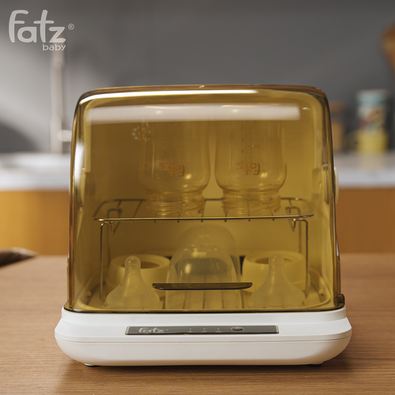 - Trước khi cho vào tủ khử trùng, hãy đổ hết nước ra khỏi bình sữa. Không xếp chồng các chai; đặt chúng thẳng đứng từng cái một