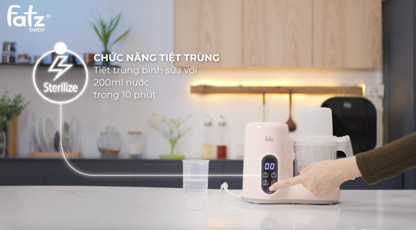 (4) Chức năng tiệt trùng: úp ngược bình sữa và nhấn nút tiệt trùng, máy sẽ tự động đun sôi nước trong 10 phút