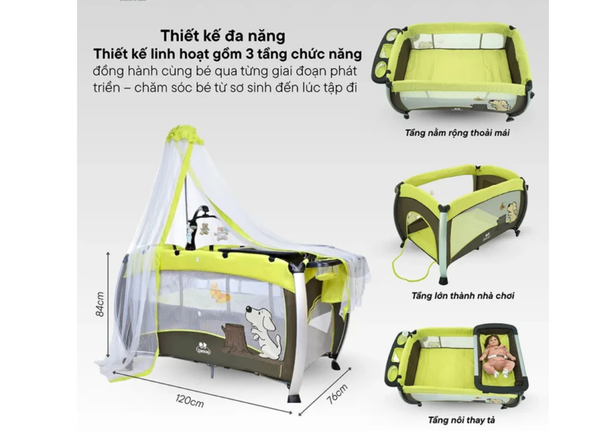 • Tặng kèm thanh treo nôi, ngăn đựng tã và mùng che
