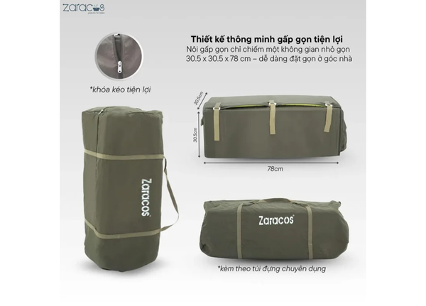 Sau khi gấp, nôi chỉ chiếm một không gian nhỏ gọn 30.5 x 30.5 x 78 cm – dễ dàng đặt gọn trong góc nhà, cốp xe hoặc vali du lịch. Sản phẩm còn đi kèm túi đựng chuyên dụng, cực kỳ tiện lợi cho cha mẹ mang theo bé trong các chuyến đi xa hay khi về quê thăm người thân.