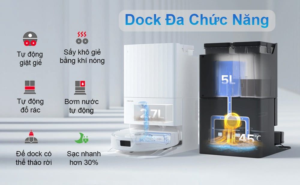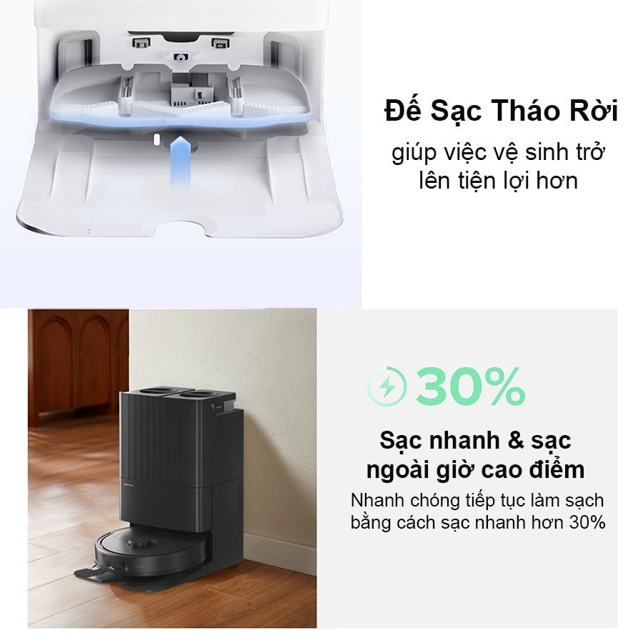 Dock sạc toàn năng với thiết kế tinh tế, gọn nhẹ nhưng chứa đầy đủ chức năng tiện ích. Bao gồm: tự động đổ rác, tự động giặt & sấy khô giẻ lau bằng khí nóng, tự động bơm nước sạch vào hộp nước, đế sạc có thể tháo rời để vệ sinh, sạc nhanh hơn 30% giúp QRevo nhanh chóng quay trở lại dọn dẹp các khu vực còn lại.