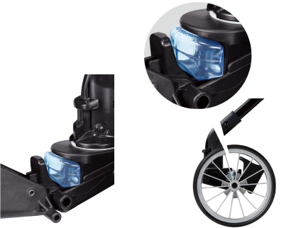 - Hệ thống các giảm shock đa diện ở khung – trục bánh xe nhờ các khớp nối linh hoạt giảm thiểu lực xóc truyền từ bánh xe lên ghế ngồi của bé.