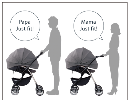 1. Tay cầm điều chỉnh độ cao với 7 mức khác nhau phù hợp với tầm cao của ba/ mẹ.