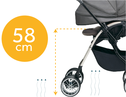 5. Ghế ngồi cao 58cm – cao nhất trên thị trường giúp cách ly khói bụi – giảm hơi nóng từ mặt đường. Đồng thời với chiều cao này, tương tác giữa mẹ và bé sẽ tốt hơn (Bé nhìn thấy mẹ ở khoảng cách gần hơn, mẹ dễ dàng hơn khi bế bé ra vào xe đẩy).