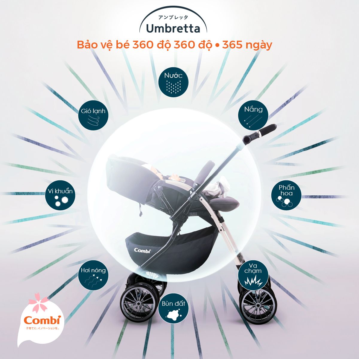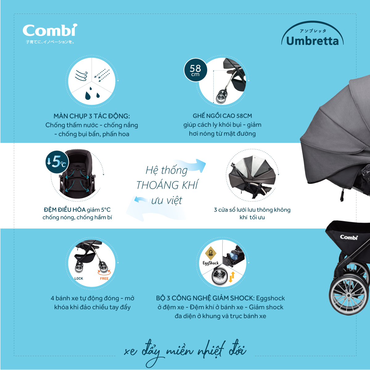 - Umbretta là xe đẩy duy nhất có màn chụp 3 tác động :