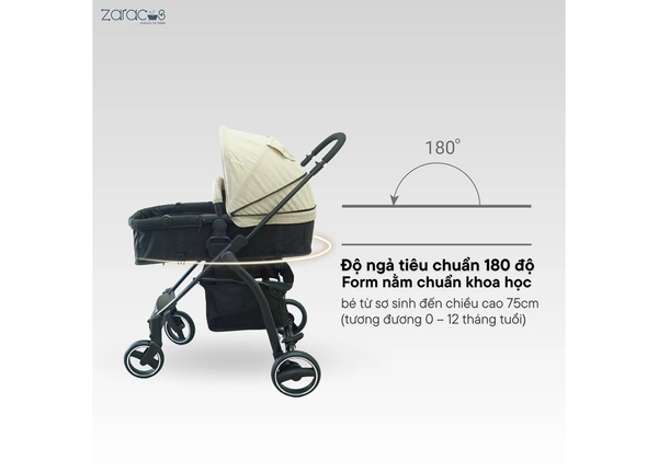 Phần nôi nằm được thiết kế chuyên biệt với độ ngã thẳng 180 độ cho trẻ sơ sinh đến 12 tháng tuổi (chiều cao tối đa 75cm), mang đến không gian nằm rộng rãi, thoáng mát và phù hợp với từng giai đoạn phát triển ban đầu.