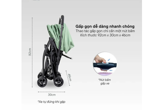 Sau khi gập, xe tự đứng vững vàng mà không cần điểm tựa, thuận tiện cho việc cất giữ trong nhà hay mang theo khi di chuyển. Kích thước sau khi gấp chỉ 92 x 30 x 46 cm, cực kỳ tiết kiệm không gian – vừa vặn cốp xe, phù hợp cho mọi chuyến đi cùng bé.
